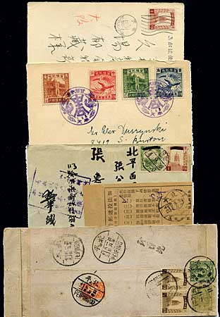 Manchukuo, Postal History, 25 covers or postal cards, noted native covers, railroad cancel, "not recognized" usage to China, Chinese postage due, plus group of 87+ commemorative cancels on cards or covers incl. First Day's, noted #32-35 (cat. ¥12,000) and first flights, interesting group, Fine to Very Fine. Estimate $350-450.