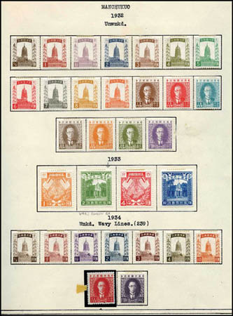 Manchukuo, Complete Mint Collection, o.g. on album pages, clean lot, Fine to Very Fine. Scott $1,578. Estimate $350-450.