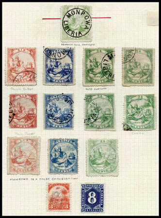 F Liberia, First Issues Forgeries, 14 pieces, all with fake cancel, lovely examples, Fine to Very Fine. Estimate $100-150.