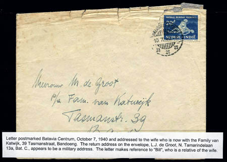 Netherlands East Indies, Home Guard W.W.II Correspondence, Soldier L.J. de Groot (Serial #223107) and his extended family, identified group of 28 covers and contents, Field postcards, lettersheet, Japanese POW cards all originating from Batavia, few forwarded, some written in English, also addressed to Red Cross, also death notice, death certificate, restitution, etc., overall fine condition. Estimate $1,500-2,000.
