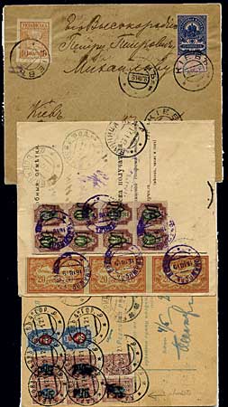 Ukraine, 1920s Postal History, 26 covers or money orders, various Trident overprints, plus 1918 commemorative issues, noted #48 strip of 3 (2) on money order, inspect, generally Fine. Estimate $250-350.