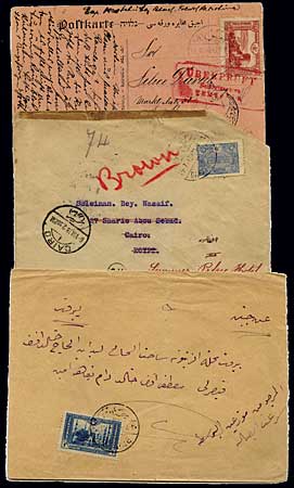 o/ Turkey, Offices in Palestine Covers and Used, 20 covers or cards, plus numerous singles with town cancels, noted various Jerusalem, Turkish Field Post Office, Quart Israelite, Petah Tikwa, Damas-Caifa railroad, exceptional group, inspection will be rewarded, generally Fine to Very Fine. Estimate $1,500-2,000.