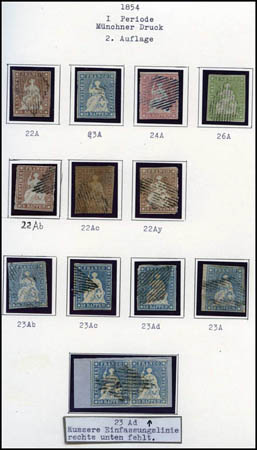 o Switzerland, Specialized "Strubel" Collection 1854 to 1862, A highly specialized used collection mounted on blank pages in a Biella album, hundreds of singles, lots of multiples and over 60 covers, a fair number of certificates present and everything identified using the Zumstein Specialized Catalog, a small sample incl. (Zumstein #s) 22Aa, 23Aa (4), 24Aa, 27D, 23E certificate, 22F (2), 24 fine to 25F, 23Aa and the following on covers; 23Aa (and one on front), 24F, 25Fb, 24 fine to 25F on one cover, etc., there are a few flaws, as always, but condition is much above average with plenty of 4 frameline examples, a wonderful lot for the specialist, Fine to Very Fine. Estimate $10,000-15,000.
