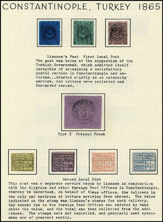/o Turkey, Ottoman Empire Locals, mint and used on homemade pages, incl. 1865 Lianno's Post (first and second issues), Egyptian postal seals, 1865 DBSR, most unusual group, generally Fine to Very Fine. Estimate $200-300.