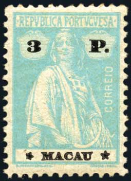 Macao, 1924, 3p Pale Turquoise, Afinsa #257, l.h., Very Fine. Scott #237 $425. Estimate $150-200.