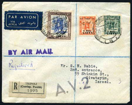 Libya, 1951, 2mal, 4mal, 24mal on A.V.2 Cover to Israel, Sassone #25-26, 30, tied by Tripoli 25.2.52 to registered cover, few soiled perf tips, otherwise Fine to Very Fine. Scott #103-104, 108. Sassone €2,000+. Estimate $300-400.