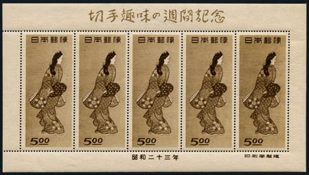 Japan, 1948, 5y Philatelic Week, miniature sheet of 5, #422a. O.g., small faults, Fine to Very Fine appearing. Sakura #C140 50,000 yen. Scott $275. Estimate $50.