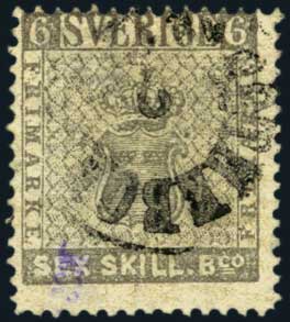 o Sweden, 1855, 6sk gray, #3. Used, thin, owners handstamp on reverse which shows through slightly on front, Average. Facit #3 SKr 12,000. Scott $1,400. Estimate $100.