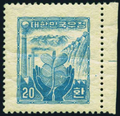 Korea (South), 1955 20h blue watermarked, #211. N.h., Fine to Very Fine. Korea P.S.C. #130 Won 1,600,000. Scott $1,250. Estimate $400.