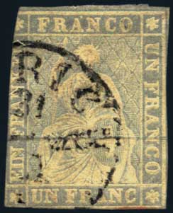 o Switzerland, 1855, Sitting Helvetia ("Strubel"), 1fr lavender, black silk threads, #30. Used, cut into design at left, Average. Zumstein #27C 1,300 SFr. Scott $1,000. Estimate $70.
