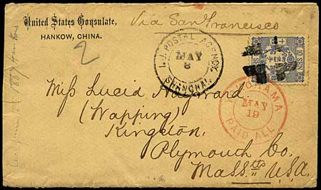 Japan, 1875, Cherry Blossom, 10s ultramarine, foreign wove paper, with syllabic on cover, #45. 1887 with Japanese Postal Agency Shanghai May 8th cancel, stamp tied by Yokohama Paid All May 19th red cancel with U.S. Consulate Hankow China corner card, addressed to Kingston Mass. with Via San Francisco ms. marking and rec. June 15, 1887 in ms. at left, San Francisco Paid All Jun 6 backstamp in red, cover opened at left with some small tears, Fine. Estimate $150.