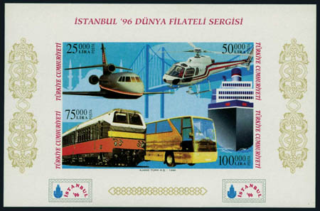 Turkey, 1996 Istanbul Stamp Expo souvenir sheet, #2660 var. N.h., perforated example plus 2 imperf copies, one with red inscription, Fine to Very Fine. Scott $170+. Estimate $100.