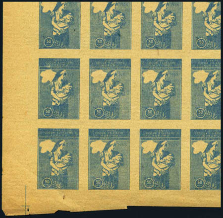 P Turkey, Postal Tax, 1966 trial color proofs imperf sheet of 100. 2 different printed on both sides, some staining at lower right, Fine. Estimate $500.
