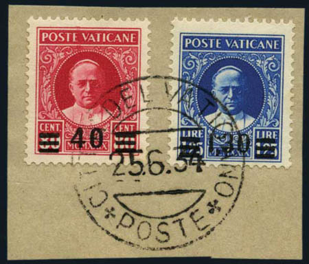 Vatican, 1934, 40c-3.70L Provisional surcharges complete, #35-40. Used on 2 pieces tied with 25-6-1934 cancels, Fine to Very Fine. Sassone #35-40 €2,000. Scott $1,627+. Estimate $400.