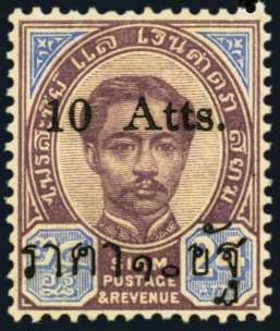Thailand, 1899 King Chulalongkorn, 10a on 24a lilac & blue, antique surcharge, #57. O.g., very scarce stamp, Fine. Sakserm #64f Baht 25,000. Scott $825. Estimate $300.