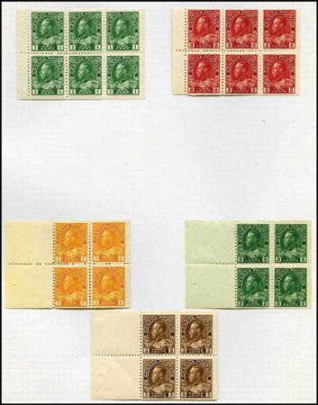 B Canada, Early booklet pane group. Hinged once on pages, 21 panes through GVI, Fine to Very Fine. Scott $1,060+. Estimate $300.