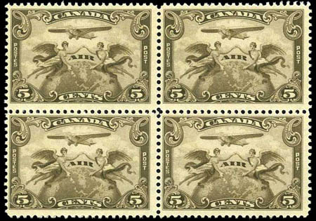 Canada, Airpost 1928-1938 complete mint, #C1-C6. N.h. (bottom), l.h. (top) blocks of 4, overall Very Fine. Scott $861+. Estimate $200.