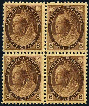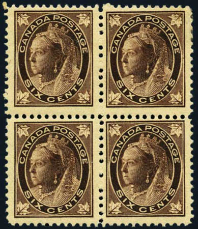 Canada, 1898 "Numeral", 6¢ brown, block of 4, #80. N.h. (bottom), l.h. (top), rich color, Fine. Scott $1,140+. Estimate $300.