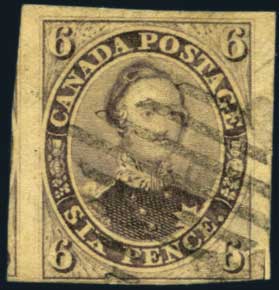 o Canada, 1855, Prince Albert, 6d slate gray, #5. Used, 3 nice margins, cut in at bottom, small thin, Fine appearance. Scott $1,500. Estimate $150.