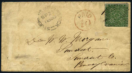 Canada; Nova Scotia, 1851, 6d yellow green on cover to Pennsylvania, #4. Tied by oval killer (stamp has faults), with PAID 10 in red and St. Johns New Brunswick Sp 23, 1858 cancel, Kentville N.S. Sp 25, 1858 backstamp, cover has staining, Very Good to Fine. Scott $1,600. Estimate $200.