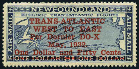 Canada; Newfoundland, Airmail, 1932, $1.50 on $1 Dornier DO-X, #C12. O.g. (h.r.), owners handstamp on reverse, Fine to Very Fine. Scott $275. Estimate $100.