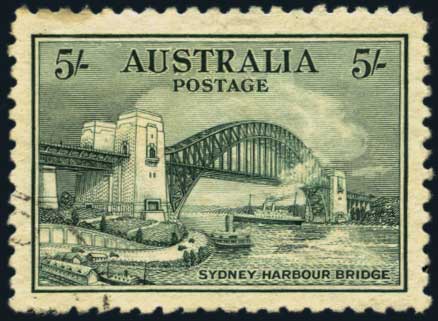 o Australia, 1932, 5/- Sydney Bridge, #132. Used, small perf stain at upper left, Fine to Very Fine. SG #143 £200. Scott $350. Estimate $100.