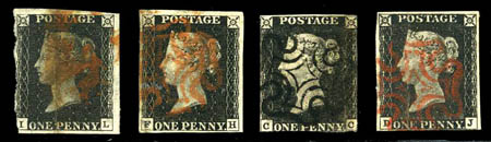 o Great Britain, 1840, 1d black, #1. 4 used copies, one with 4 margins, all with small faults, Very Good to Fine. SG #2 £1,700. Scott $1,200. Estimate $150.