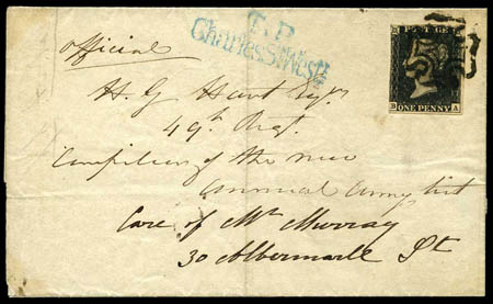 Great Britain, 1840, 1d black, #1. On 2 covers, both with 3 margins, one with red Maltese Cross cancel barely tied, other tied with black Maltese Cross cancel and T.P. CharlesStWest straightline cancel in blue, both covers with creases, Fine. SG #2 £1,200. Scott $1,250. Estimate $200.