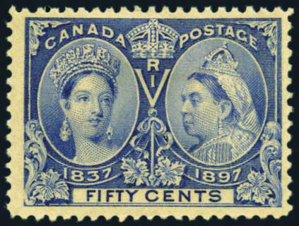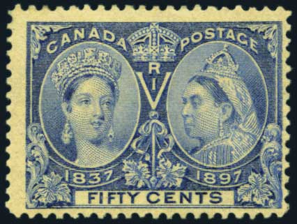 Canada, 1897 Jubilee, 50¢ ultramarine, #60. O.g., rich color, Fine to Very Fine. Scott $375. Estimate $120.