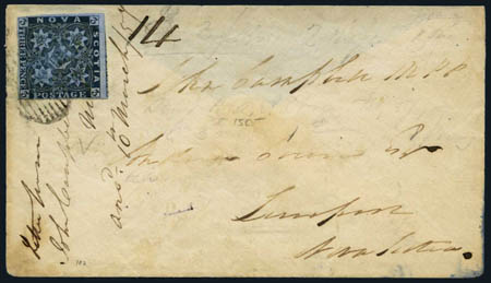 Canada; Nova Scotia, 1851, 3d bright blue on folded letter, #2. 4 margin copy with small tear tied by grid cancel with ms. 14, addressed to London Nova Scotia, back flap missing, Fine. Scott $325. Estimate $50.