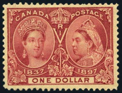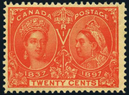 Canada, 1897 Jubilee, 20¢ vermilion, #59. O.g., rich color, Fine to Very Fine. Scott $275. Estimate $80.