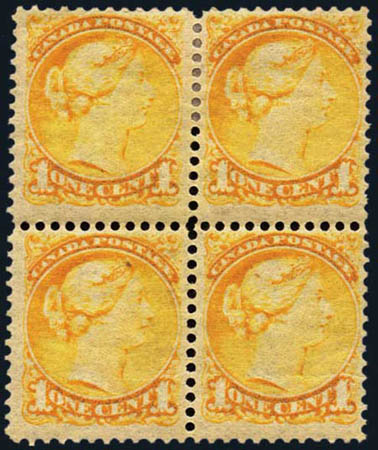 Canada, 1870, Small Queen, 1¢ yellow, block of 4, #35. N.h. (bottom), o.g. (top), centered, fresh, Fine to Very Fine. Scott $315+. Estimate $100.