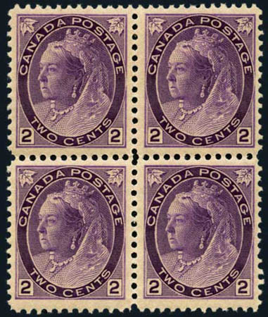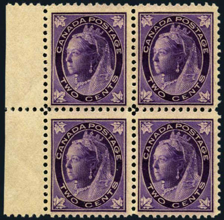 Canada, 1897 "Maple Leaf", 2¢ purple, block of 4, #68. N.h. (bottom), l.h. (top), marginal, rich color, Fine. Scott $280+. Estimate $100.