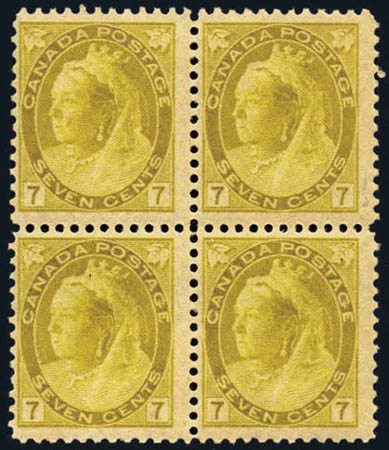Canada, 1902 "Numeral", 7¢ olive yellow, block of 4, #81. N.h. (bottom), l.h. (top), rich color, Fine. Scott $900+. Estimate $200.