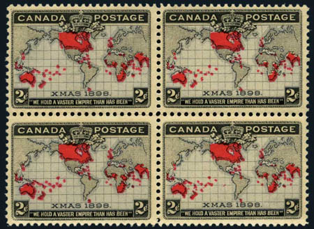 Canada, 1898, Imperial Penny Postage, 2¢ black, lavender & carmine, block of 4, #85. N.h. (bottom), l.h. (top), rich color, Fine to Very Fine. Scott $270+. Estimate $100.