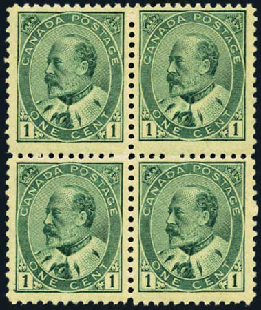 Canada, 1903, 1¢ green, block of 4, #89. N.h. (bottom), l.h. (top), rich color, Fine. Scott $245+. Estimate $70.