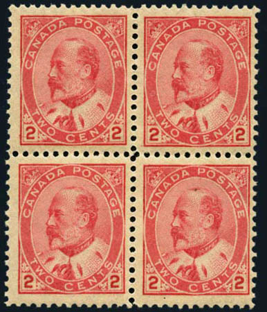 Canada, 1903, 2¢ carmine, block of 4, #90. N.h. (bottom), l.h. (top), rich color, Fine to Very Fine. Scott $265+. Estimate $80.