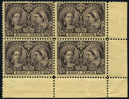 Canada, 1897 Jubilee, 8¢ dark violet, block of 4, #56. N.h. (bottom), l.h. (top) corner, rich color, Fine. Scott $840+. Estimate $200.
