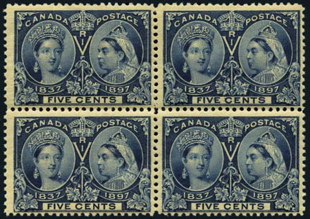 Canada, 1897 Jubilee, 5¢ deep blue, block of 4, #54. N.h. (bottom), l.h. (top), rich color. Scott $440+. Estimate $120.