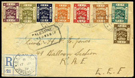 Worldwide Covers, Middle East 2 interesting usages. Palestine 1919 franked with #4-11, tied by Jerusalem cancels addressed to 49 Balloon Section RAF, EEF, with Field post back stamps, torn at top; Syria C7 pair, C8-9 barely tied on 1921 local cover, trimmed at top and right, Fine. Estimate $100.