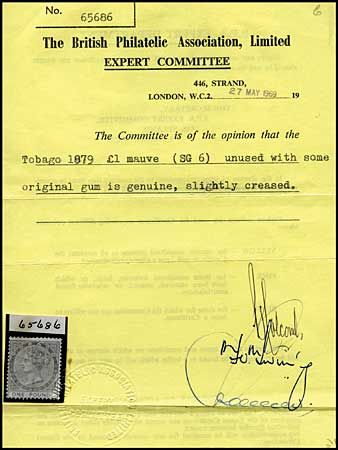 Trinidad & Tobago; Tobago, 1879, £1, SG #6, o.g., "slightly creased", scarce item, Fine, BPA (1969) cert.