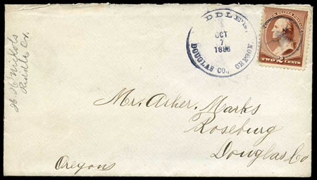 U.S.; State Postal History, Oregon, Riddle's, Douglas Co, J D Johnson PM. 2 county/postmaster; July 21, 1883 Whittlesey type 1 on 3¢ green entire to Roseburg, very minor staining; October 7, 1886 Whittlesey type 2 with 2¢ brown bank note, very minor staining, on one exhibit sheet, Doane-Thompson #3359, Very Good to Fine. Both Marks correspondence. Whittlesey rarity 6 for both . Estimate $150.