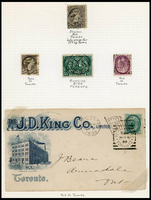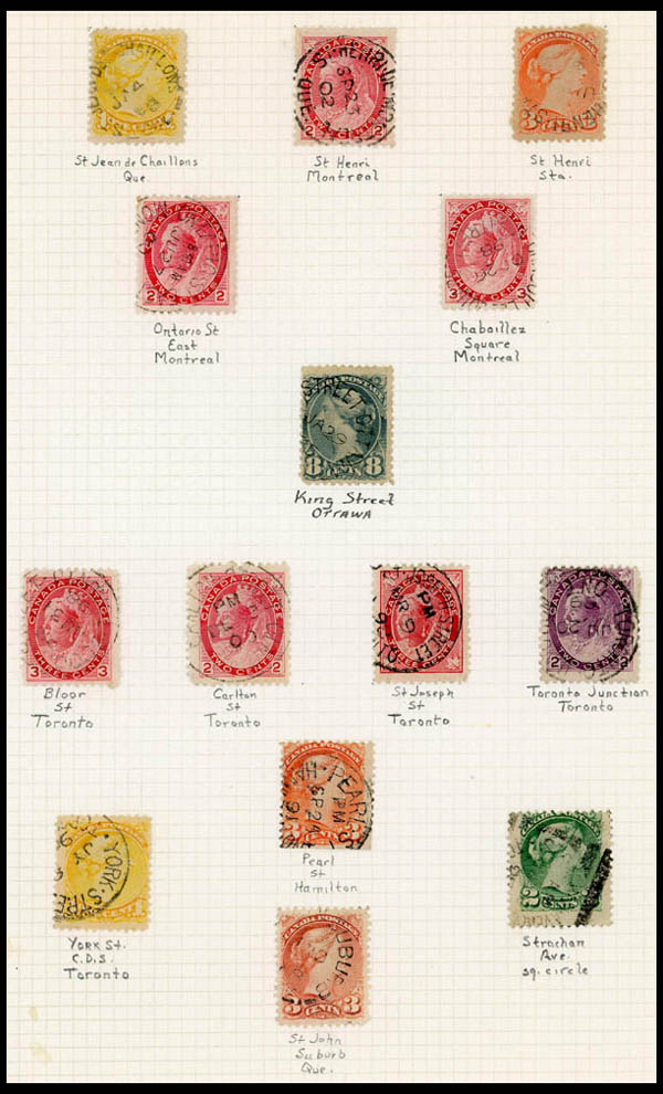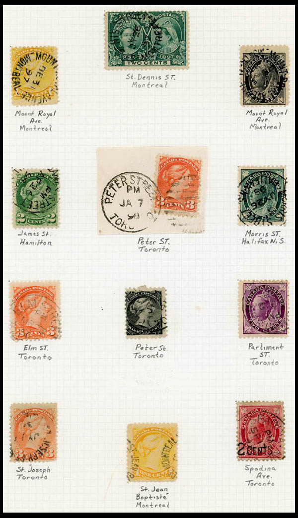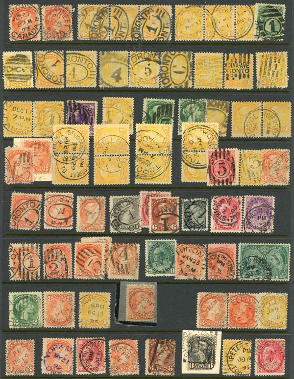 Canada, Mostly Street and Sub P.O. Cancels, many hundreds on stockpages and few mounted, mostly 3c small Queens and later, few strips, some identified, around 37 covers or postcards, etc., interesting lot that took some time to assemble, inspect, Fine to Very Fine usage. Estimate $300-400.