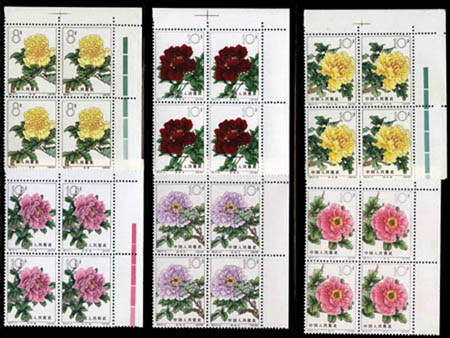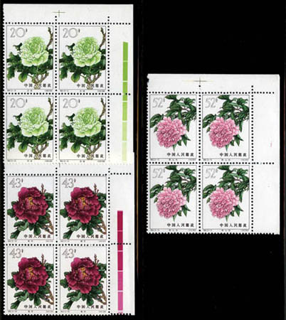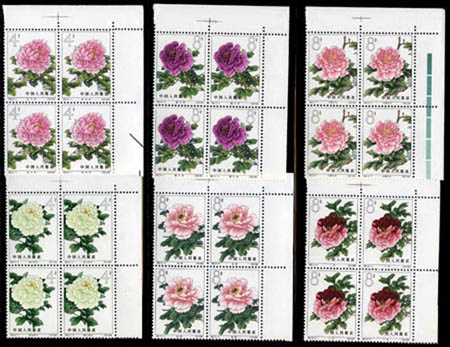 China; People's Republic, 1964, 4f-52f Chinese Peonies complete, #767-781. Blocks of 4, n.h., few light creases, Fine to Very Fine. Scott $2,810. Estimate $800.