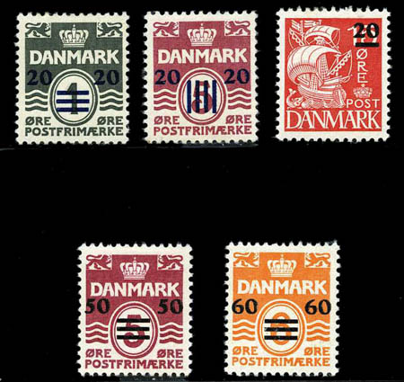 Faroe Islands, 1940-41 British Administration surcharges complete, #2-6. O.g., #4 signed, Fine to Very Fine. Facit #4-8 SKr 3,600. Scott $575. Estimate $150.