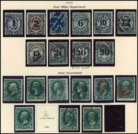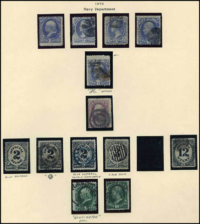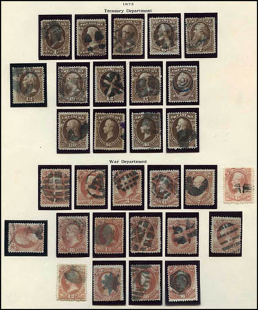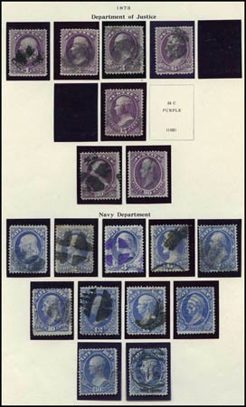 U.S. Back of the Book Collections, Used Official Collection, Few hundred incl. Postal Savings on Scott pages (dupl.), interesting cancels, Continental Bank Note incl.Agriculture complete to 10¢, plus 15¢, Executive 3¢, Interior complete, Justice complete except 10¢, 12¢, Navy complete, State to 12¢, 24¢, 30¢, scattered American Bank Note incl. #O97-98, 101, 106, Treasury, War, P.O. complete with dupl., some dupl. with better cancels incl. colored, also stationery P.O. Dept. cancel group, few multiples incl. Treasury, 1873 6¢ Navy showing part number, 30¢ P.O. with Foreign Mail cancel, occasional fault, generally Fine to Very Fine. Ex Skinner. Estimate $500-700.