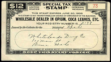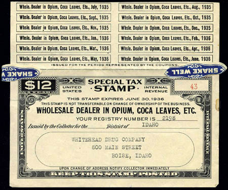 U.S. Back of the Book Collections, Special Tax Stamps For Opium, Etc., 6 diff. from 1930 to 1937, $3 and $12 black forms, 1935 to 1937 with coupons attached, seldom offered, leading Revenue dealer retail $1000+ for same items, Fine to Very Fine. Estimate $300-400.