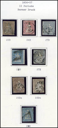 Switzerland, Specialized "Strubel" Collection 1854 to 1862, A highly specialized used collection mounted on blank pages in a Biella album, hundreds of singles, lots of multiples and over 60 covers, a fair number of certificates present and everything identified using the Zumstein Specialized Catalog, a small sample incl. (Zumstein #s) 22Aa, 23Aa (4), 24Aa, 27D, 23E certificate, 22F (2), 24 fine to 25F, 23Aa and the following on covers; 23Aa (and one on front), 24F, 25Fb, 24 fine to 25F on one cover, etc., there are a few flaws, as always, but condition is much above average with plenty of 4 frameline examples, a wonderful lot for the specialist, Fine to Very Fine. Estimate $10,000-15,000.