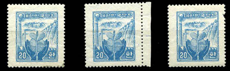 Korea (South), 1955 20h blue watermarked, #211. 3 copies o.g. with small faults, Fine appearing. Korea P.S.C. #130 Won 4,800,000 (n.h.). Scott $1,500. Estimate $150.