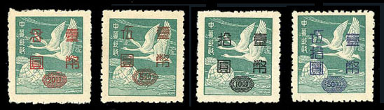Taiwan, 1952, Silver Yuan Surcharges on Flying Geese, $5-$50 Complete, #1042-1045, ungummed, Fine to Very Fine.